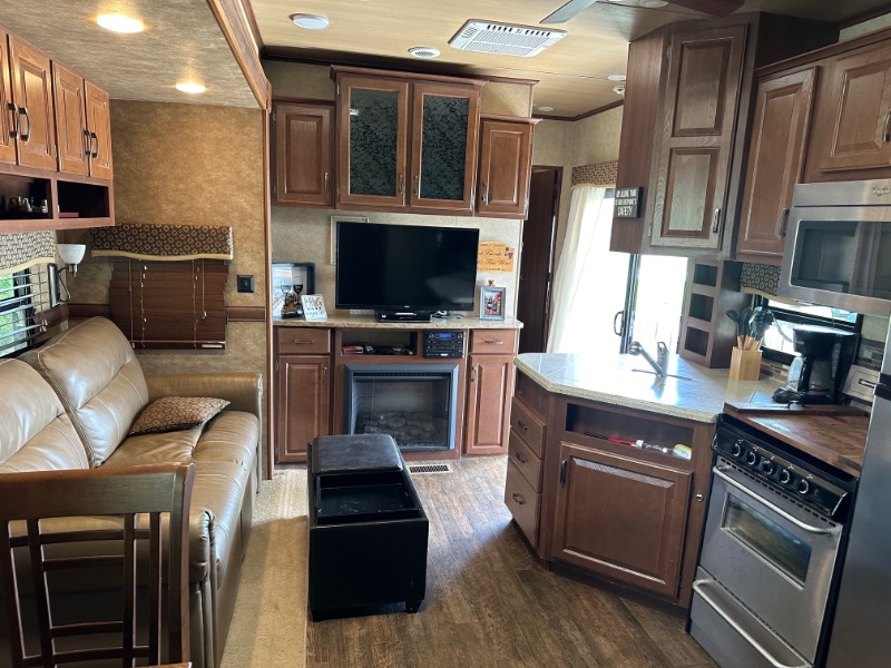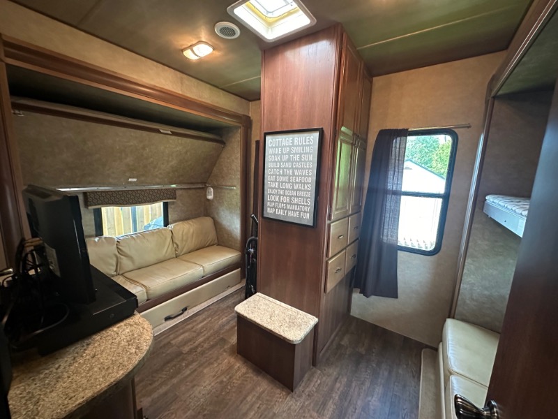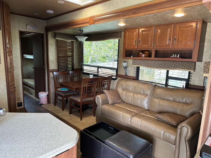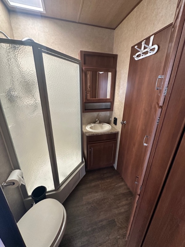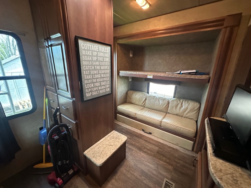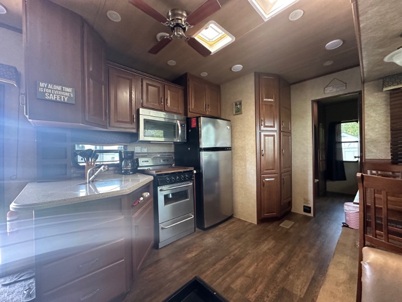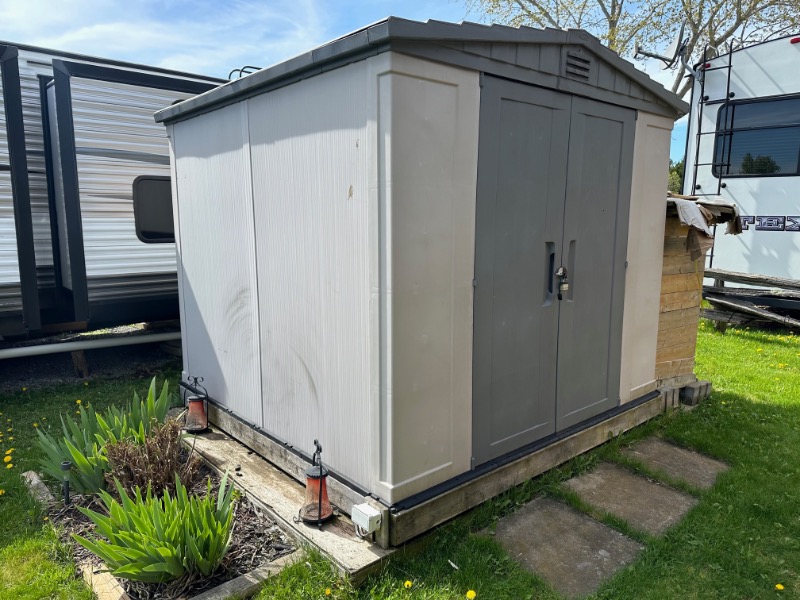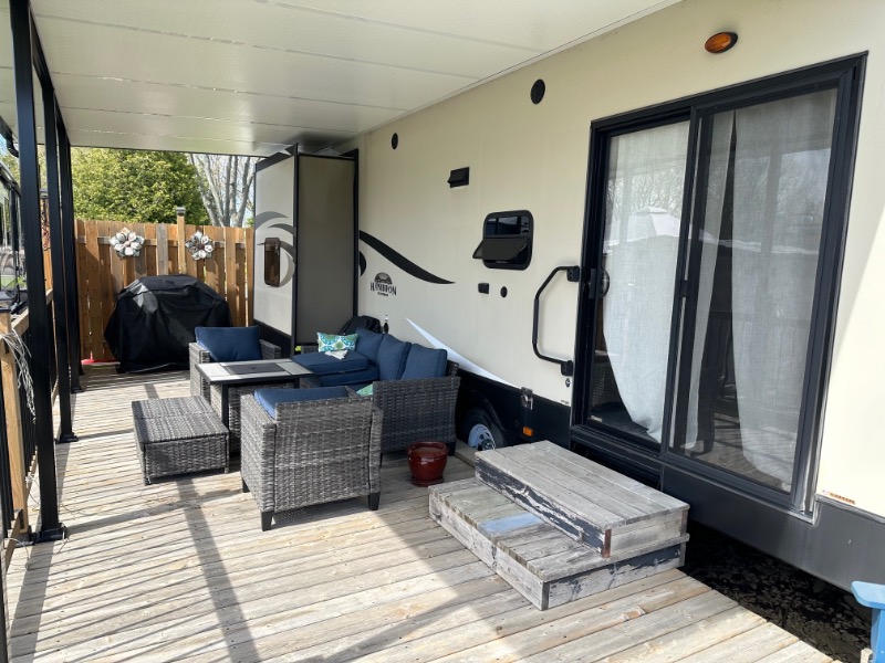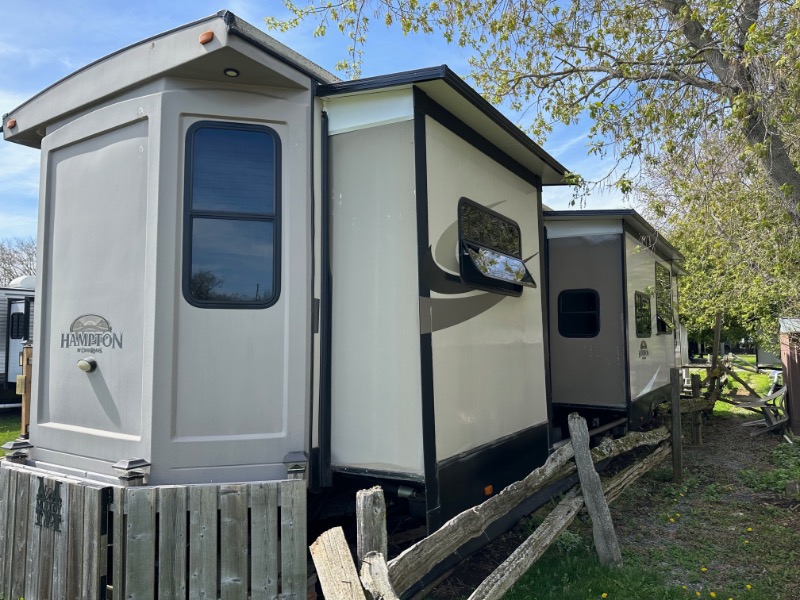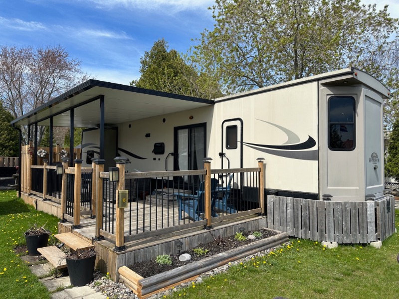 This clean two bedroom, one and a half bathroom trailer is perfect for a family! The master bedroom is located at the front of the trailer, along with the main bathroom. The kitchen and living area takes up the centre of the trailer. At the back you will find a large bunk room with a half bath and opposing slides, with plenty of storage and room for to accommodate kids and visitors. The kitchen features stainless steel appliances, and a full size household fridge. Included with the purchase is a large deck with newly updated railing, and a spacious shed. The trailer features a professionally installed hard roof awning (2022) so that the outside space can be enjoyed in any weather. All 4 slides have professionally installed hard covers. Kitchenware, BBQ, and kayaks are included with the sale! Please note, patio furniture is not included. The trailer is located on site 6, close to the pool and playground, with a slight view of the bay! 2025 season fees paid in full.